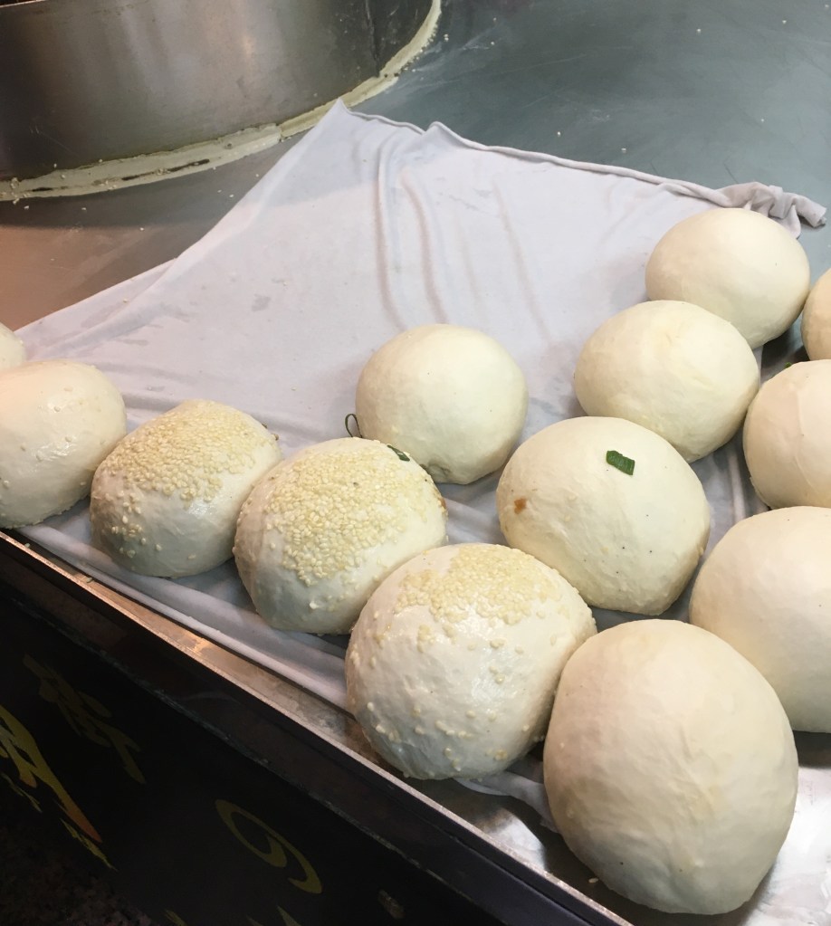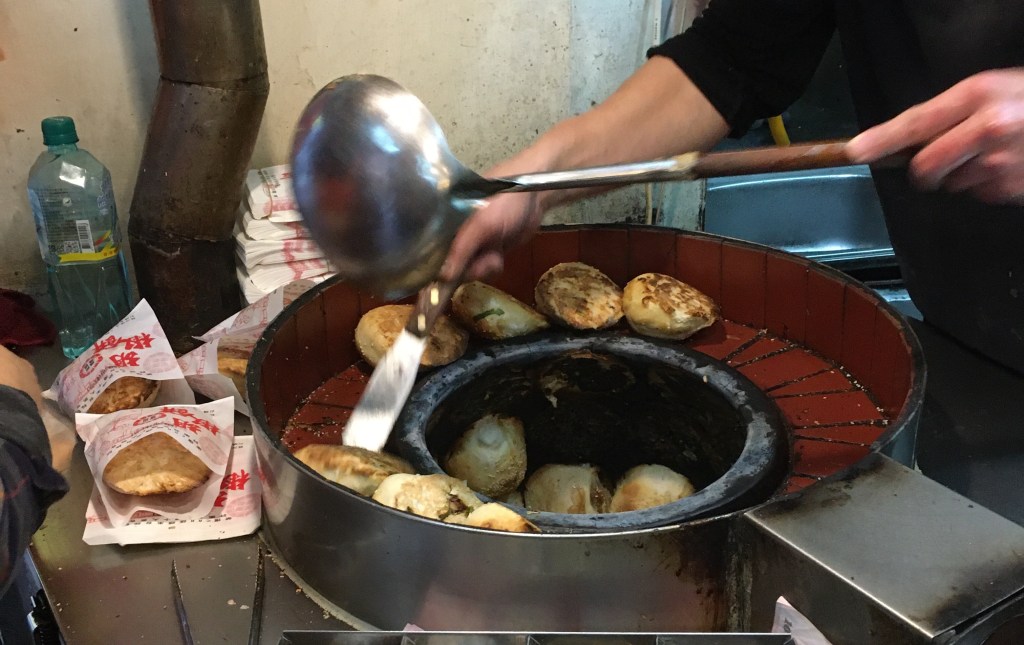 いつも行列ができていますが、並ぶ価値はあります。みんな焼き上がりを待っているのです。20分ほど並びましたが、目の前で生地をのばし、肉の餡を包み、それに刻み葱を持ってから手早く包んでいくのを見ているうちに時間は過ぎていきます。